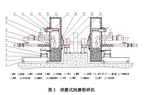 JHM 系列球磨式細磨粉碎機主要由磨機筒體、可調進風管、出風(料)口、進料螺旋、靜止盤、滑動座、軌道座、磨介、傳動系統(tǒng)等幾部分組成。在磨機筒體一個端面的中心位置設置靜止盤,靜止盤和磨機筒體組成了完整的粉磨腔體。靜止盤的外圓與該端面的中心孔之間留有一定間隙,使磨介球不能漏出,又能相對轉動。加料口、定向反吹管和帶“籠形”分級葉輪的分級器設置在靜止盤上;靜止盤通過螺栓與滑動座連接,固定在軌道座上;磨機筒體內裝有磨介;磨機筒體的另一個端面通過軸端法蘭與傳動系統(tǒng)連接,從而實現(xiàn)磨機筒體的傳動。工作時,物料從進料螺旋加入磨腔內,隨磨介被旋轉的筒體提升到一定高度,由于介質堆積表面的傾角超過自然堆角后而瀉落,在瀉落過程中物料與磨介相互碰撞、擠壓、剪切、研磨,實現(xiàn)物料的磨碎。出風(料)口與抽風裝置連接,使磨機腔體內處于負壓狀態(tài);可調進風管上的多個定向噴吹管向腔體內定向吹風,把達到一定細度的物