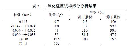 試樣為國內某知名電化企業(yè)提供的電解二氧化錳[5(] 國家輕工行業(yè)最新標準QB/T2629-2004)其電解二氧化錳抽樣參數(shù)情況如表1所示,試樣粒度經(jīng)篩分分析,粒度分布如表2所示。