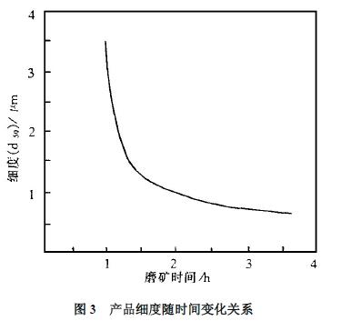 由圖3 可見,隨著磨礦時間的延長,產(chǎn)品粒度顯著變細,當磨礦時間為4h 時,磨礦細度為d50=0.73μm。