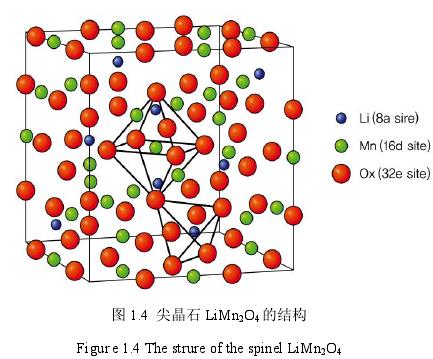 在一些尖晶石結構的 Li M2O4(M=Ti,V,Mn)化合物中,氧原子按照 ABCABC進行立方密堆積。Li Mn2O4為例的尖晶石結構如圖 1.4 所示,鋰離子占據氧原子的 8a 四面體,過渡金屬離子會占據氧原子的 16d 八面體位置,其具體的排列情況由靜電引力、庫倫斥力和離子半徑等因素決定。