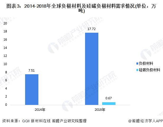 圖表3:2014-2018年全球負(fù)極材料及硅碳負(fù)極材料需求情況(單位:萬噸)