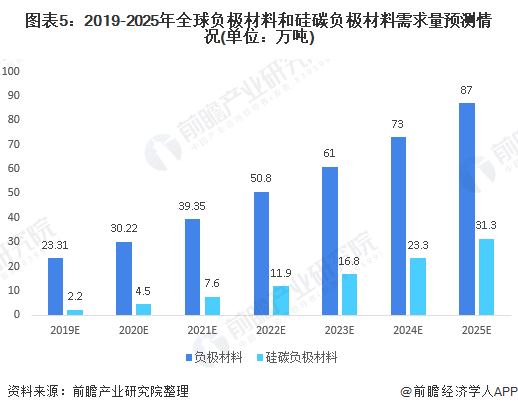 預(yù)計(jì)2025年硅碳負(fù)極材料滲透率將達(dá)到36%左右,而根據(jù)中國(guó)物理與化學(xué)行業(yè)協(xié)會(huì)預(yù)測(cè),2020-2022年全球負(fù)極材料需求將分別達(dá)到30.22萬噸、39.35萬噸、50.80萬噸,年復(fù)合增長(zhǎng)率為29.65%。前瞻在此基礎(chǔ)上預(yù)計(jì)2023-2025年隨著負(fù)極材料下游需求領(lǐng)域發(fā)展的放緩,預(yù)計(jì)2025年全球負(fù)極材料需求將達(dá)到87萬噸左右。按照這一數(shù)據(jù)以及前文對(duì)全球硅碳負(fù)極材料滲透率的預(yù)測(cè),2025年全球硅碳負(fù)極材料需求量將達(dá)到31萬噸左右。