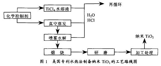 美國專利L1 uJ6440383 B1提出了由TiC14溶液生產納米級TiO2的嶄新的水熱法:將一定濃度的TiC14鹽酸溶液真空蒸發進入噴霧干燥器(或直接將溶液加入到噴霧干燥器),使其在高于溶液沸點和低于能使晶體快速成長的溫度下進行水熱反應, 以薄膜的