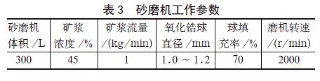 砂磨機是目前物料適應性最廣、最為先進、效率最高的濕法研磨設備,根據使用性能大體可分為臥式砂磨機、籃式砂磨機、立式砂磨機等[7]。砂磨機與球磨機、輥磨機、膠體磨等研磨設備相比較,具有生產效率高、連續性強、成本低、產品細度高等優點。本次試驗采用的臥式砂磨機工作參數見表3,采用氧化鋯球做研磨介質。