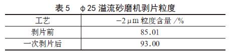 在表3 的工作參數下,砂磨機剝片粒度數據見表5。分析表5 可知:臥式砂磨機的剝片效果較好,可以將φ25 溢流-2μm 粒度從85.01% 提升到93%。