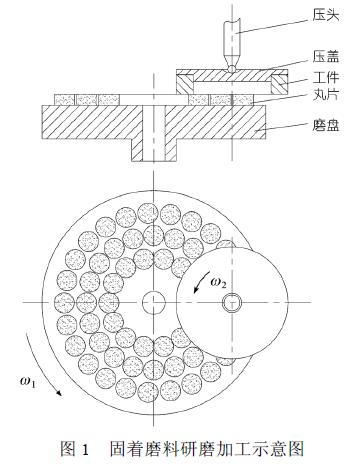 固著磨料高速研磨是將散粒的磨料固結起來,制成專用磨具, 在高速研磨機上對工件進行高速研磨的方法. 所用的專用磨具是根據工件的要求,用不同的磨料制成丸片, 再將丸片粘結到磨盤上,制成不同形狀的磨具, 其構造如圖1 所示.固著磨料高速研磨與傳統的散粒磨料慢速研磨相比具有以下優點[1~4]: