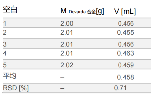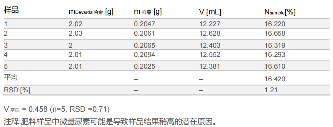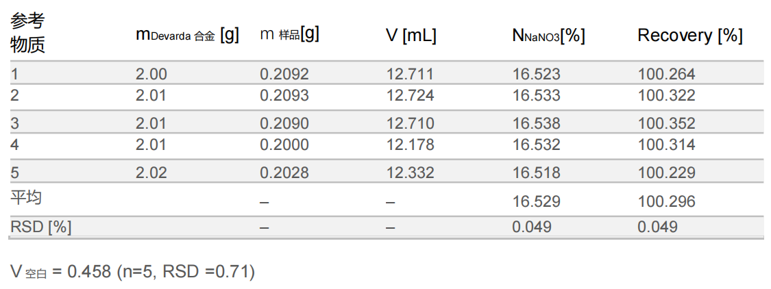 用該方法測定硝酸鈉和化肥中的氮,結果可靠,重現性好。這些結果與給定的硝酸鈉值吻合得很好。加樣回收率為 100.296 % (RSD = 0.049%),在 98 ~ 102% 的標準范圍內。