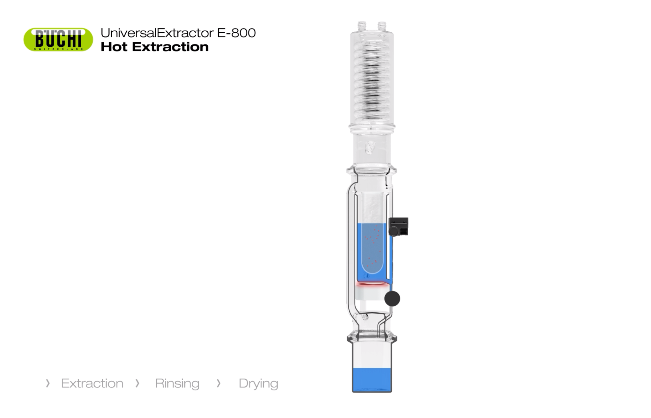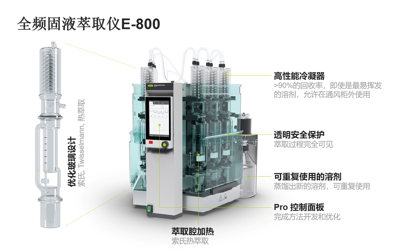 BUCHI 的全頻固液萃取儀 E-800 功能強大,適合各種高要求的萃取任務,提供 6 個獨立的萃取位置,可以實現單獨過程控制。E-800 在所有流程步驟中防止熱敏分析物的變質和降解,確保萃取物的安全性和可復現性,所有接觸樣品和溶劑的組件均完全由惰性材料制成,可消除浸出材料造成的樣品污染和任何溶劑效應的影響。