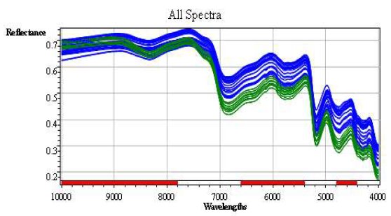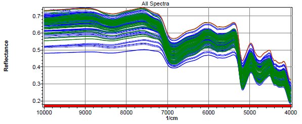 選取廣陳皮 17 批,川陳皮 8 批,在 60 ℃ 烘箱中干燥后粉碎,過 80 目篩,取 8g 樣品粉末放置樣品杯中掃描近紅外光譜,掃描范圍 10000cm-1 – 4000cm-1,分辨率 8cm-1,掃描次數 64 次,每個樣品重復裝樣后掃描 3 次。