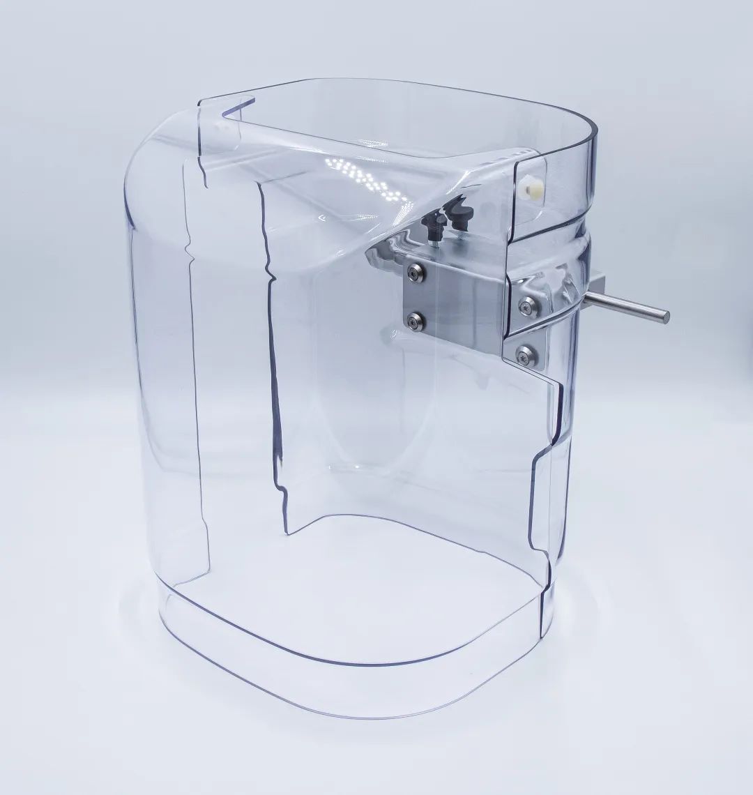 防濺罩時安裝于水浴鍋上方的全方位護罩,它區別于防護罩的單面防護功能,主要用于防止水浴鍋內的熱水或者高溫硅油濺射到實驗人員以及 R-300 主機上。受制于它全面的防護設計,在拆裝蒸發瓶時需要將其打開,因此不適合處理一些危險的化合物。