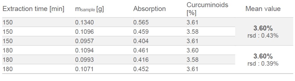 對于姜黃素的測定,姜黃樣品在 2.5h (150分鐘) 和 3 h(180分鐘) 提取時間內進行三次分析。結果如表2所示。