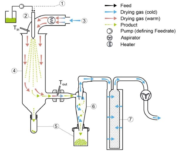 噴霧干燥是一種廣泛應用的技術,可將水溶液或有機溶液、乳劑、分散劑和懸浮液轉換為干粉。這是一個快速且一步完成的過程,使其在降低成本、易于擴大規模和操作方面具有優勢。重要的是,對溫度敏感和揮發性物質,如酶、蛋白質、抗生素、香精和香料,可以在不損失活性的情況下進行噴霧干燥。其原因是粒子在該過程中的平均停留時間僅有幾秒鐘。