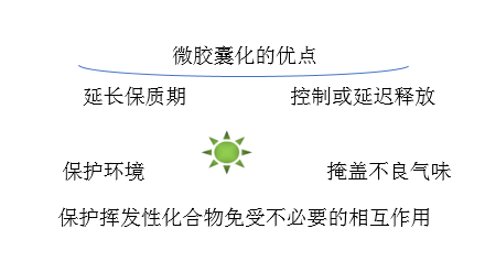 在食品和化妝品行業中,香精和香料化合物是很容易揮發的液體,通常對熱、化學不穩定,對空氣、光和輻射相當敏感。保護珍貴化合物的有效方法是將香精和香料封裝到載體基質中。微囊化的優點如圖1 所示。常用香精和香料微囊化的例子有魚油、葵花籽油、薄荷油、檸檬油以及硫磺香精。因此,直徑從亞微米到毫米不等的顆粒被稱為微膠囊。