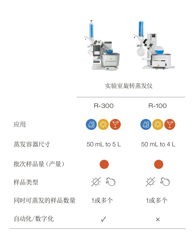 蒸發(fā)系統(tǒng)家族中最常使用的成員當然是實驗室旋轉(zhuǎn)蒸發(fā)儀。作為化學實驗室的主力軍,實驗室級的旋轉(zhuǎn)蒸發(fā)儀是蒸發(fā)和蒸餾從 20 mL 到 3 L 樣品的理想選擇。R-100 和 R-300 還可以處理光敏或者易起泡的樣品,根據(jù)不同的配件,你甚至可以同時蒸發(fā)多個樣品。你可以在檢測實驗室和研發(fā)實驗室,以及酒吧、酒廠和分子廚房中發(fā)現(xiàn)他們的身影。