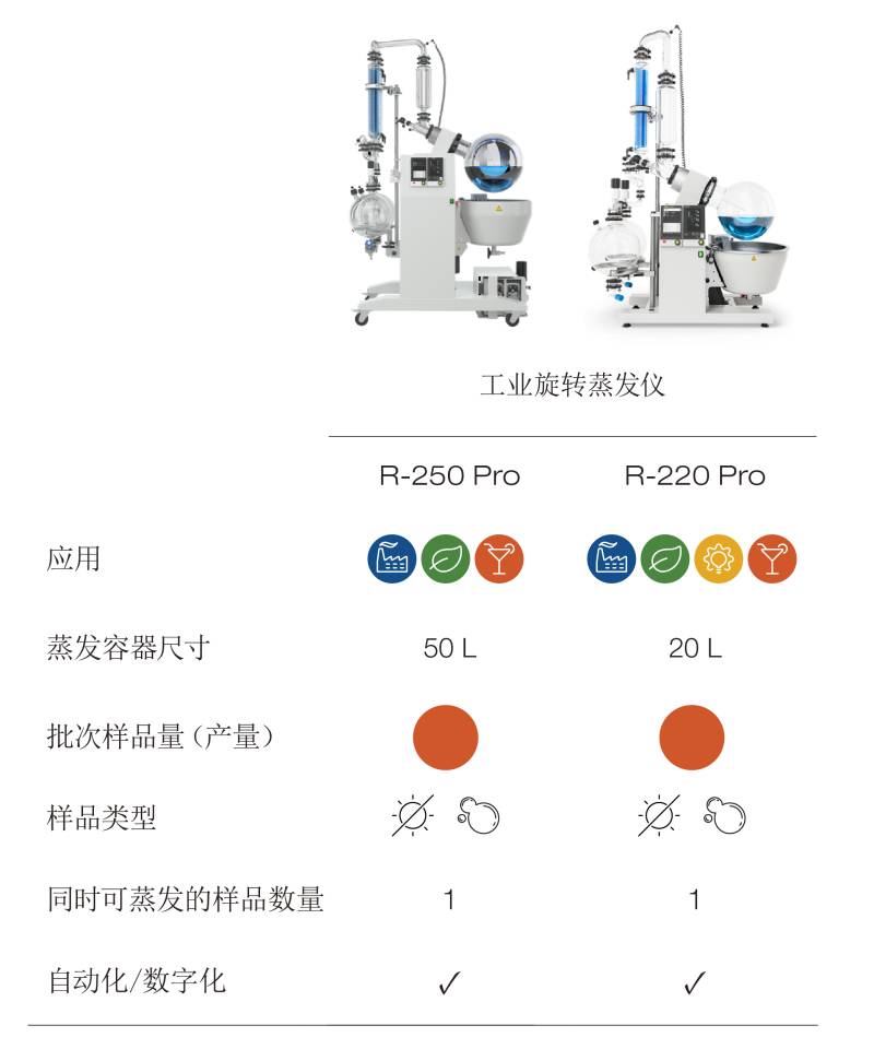 對于較大體積的樣品,工業(yè)級旋轉(zhuǎn)蒸發(fā)儀是完美的解決方案。R-220 Pro 和 R-250 Pro 可以一次處理 10 L 到 30 L 的樣品溶劑,包括光敏和易起泡的樣品。得益于大體積單次處理量,工業(yè)級旋轉(zhuǎn)蒸發(fā)儀往往用在中試和放大工藝實驗室以及工廠里。在應(yīng)用方面,制藥、天然產(chǎn)物、酒廠和香精香料都是其擅長的領(lǐng)域。根據(jù)不同的配件,可以實現(xiàn)連續(xù)自動蒸餾,或者讓整機符合防爆工廠的要求,甚至可以邊萃取天然產(chǎn)物邊蒸餾!(點擊這里查看)