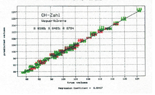 ▲ 羥值含量的化學值與模型校正值、模型預測值的相關關系圖