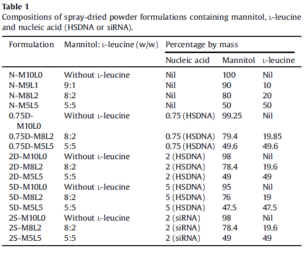 在許多體內研究中,siRNA 與遞送載體結合,并通過靜脈給藥,遞送載體可保護 siRNA 免受核酸酶降解和血清蛋白結合。對于呼吸系統的局部效應,吸入是一種有利的給藥途徑。在酶活性最低的作用位點可以實現高藥物濃度,其非侵入性提高了患者的依從性并降低了總治療成本。肺部給藥帶來的另一個吸引點是,可能不需要專門的給藥載體,而且裸 siRNA 可獲得令人滿意的基因沉默效果,這一點已在一些研究中得到證實。但關于 siRNA 的研究中,使用液體氣溶膠的研究相對較多,干粉可吸入制劑研究較為有限,本篇文獻中科學家重點研究了將裸 siRNA 以及和不同分散載體如甘露醇和L-亮氨酸通過噴霧干燥進行制劑來考察 siRNA 制備干粉可吸入制劑的可能性。