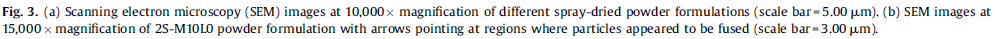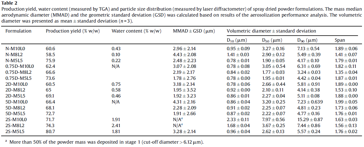 表2 通過激光衍射測量粉末的粒度,2% siRNA 的體積直徑較大,范圍為 2.6-8.0um,可見隨著配方中 L-亮氨酸含量的增加,粉末的粒徑減小。