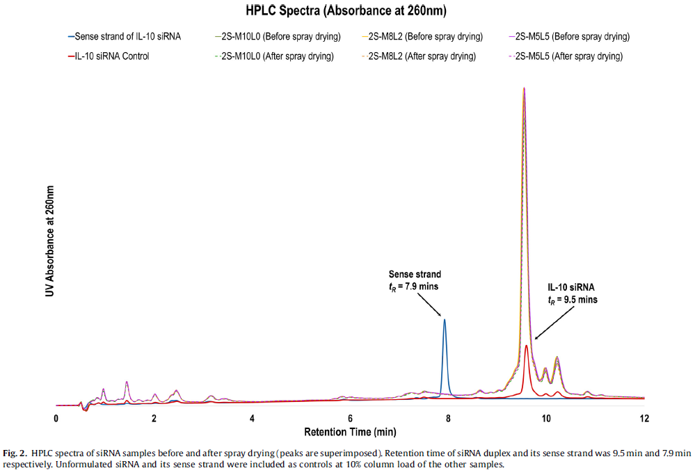 在這項研究中,香港大學和悉尼大學的科學家首次使用噴霧干燥技術將 siRNA 的裸形式配制成可吸入的干粉。研究了 siRNA 與甘露醇和 L-亮氨酸共混合后進行噴霧干燥造粒,過去沒有 siRNA 載量 >2% w/w 的吸入型 siRNA 粉劑(含遞送載體)的報道。同時 siRNA 經噴霧干燥后,即使沒有通常用于絡合或封裝保護的 siRNA 的遞送載體,也能成功保持其完整性;siRNA 粉末呈結晶狀,殘余水分低,這是穩定配方的關鍵特征,但含水量都在 5%以下,說明噴霧干燥具有良好的工藝可行性。最后摻入 L-亮氨酸富集在顆粒表面,顯著促進了粉末的分散性,改善了 siRNA 粉末的霧化效果。并通過X射線光電子能譜檢測,結果表明,L-亮氨酸在顆粒表面富集,作為分散增強劑,能夠有效促進粉末的分散。再檢測的不同 siRNA 配方中,含 50% w/w L-亮氨酸的 siRNA 表現出最佳的空氣動力學性能,其高發射分數(EF)約為 80%,適度的細顆粒分數(FPF)約為 45%,對于干粉吸入劑具有很好實際參考意義。更重要的是,通過凝膠阻滯試驗和 HPLC 評估,成功地保留了 siRNA 的完整性,確保了藥物的活性!