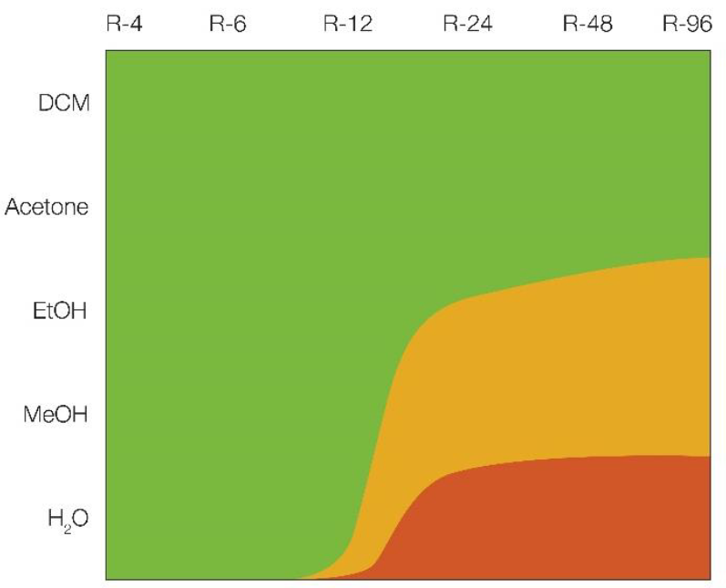 在 SyncorePlus Polyvap 上研究了不同的溶劑。AutoDest 功能能夠自動蒸發至少 90% 的初始溶劑量,使蒸發過程中溶劑無爆沸。AutoDry 功能然后進一步蒸干溶劑。結果如圖 2 所示: