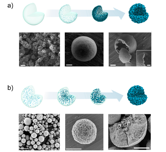 具有緩慢結晶動力學的 MOFs:應用噴霧干燥,連續流體輔助合成。由于通常需要較長的反應時間,直接注射并不方便合成含有高核團簇(如鋯-氧羥基團簇)的 MOF。這種方法通常提供緊湊的、球形的、微大小的 MOF 微粒。在噴霧干燥中,干燥室內的熱氣流縮小了微滴。在干燥過程中,前體濃度在表面增加,直到 MOF 納米顆粒開始結晶。在傳統的方法中,這導致了由納米晶(圖3a)組成的空心超結構。然而,當使用連續流反應器時,在噴霧干燥前達到均勻的簇濃度和溶液溫度。因此,MOF 納米顆粒一旦在熱干室中噴射,就開始形成,從而有利于微液滴內部的均勻結晶,最終決定了致密珠或上層結構的形成(圖 3b)。