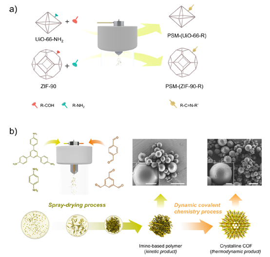 金屬有機骨架(Metal Organic Framework, MOFs)和共價有機骨架(Covalent organic frameworks, COFs)是當今最具吸引力的多孔材料之一。它們具有出色的孔隙度,應用場景廣泛,如氣體儲存,二氧化碳捕獲,氣體分離,傳感,藥物輸送和催化。傳統方法制備MOFs、COFs和相關復合材料的成本高、生產時間長。而噴霧干燥作為一種有前景的合成技術,已經在各個領域的制造過程中得到廣泛應用。它能夠快速、連續和可擴展地生產干燥的微球狀粉末,與傳統方法相比,降低了制造成本和生產時間。