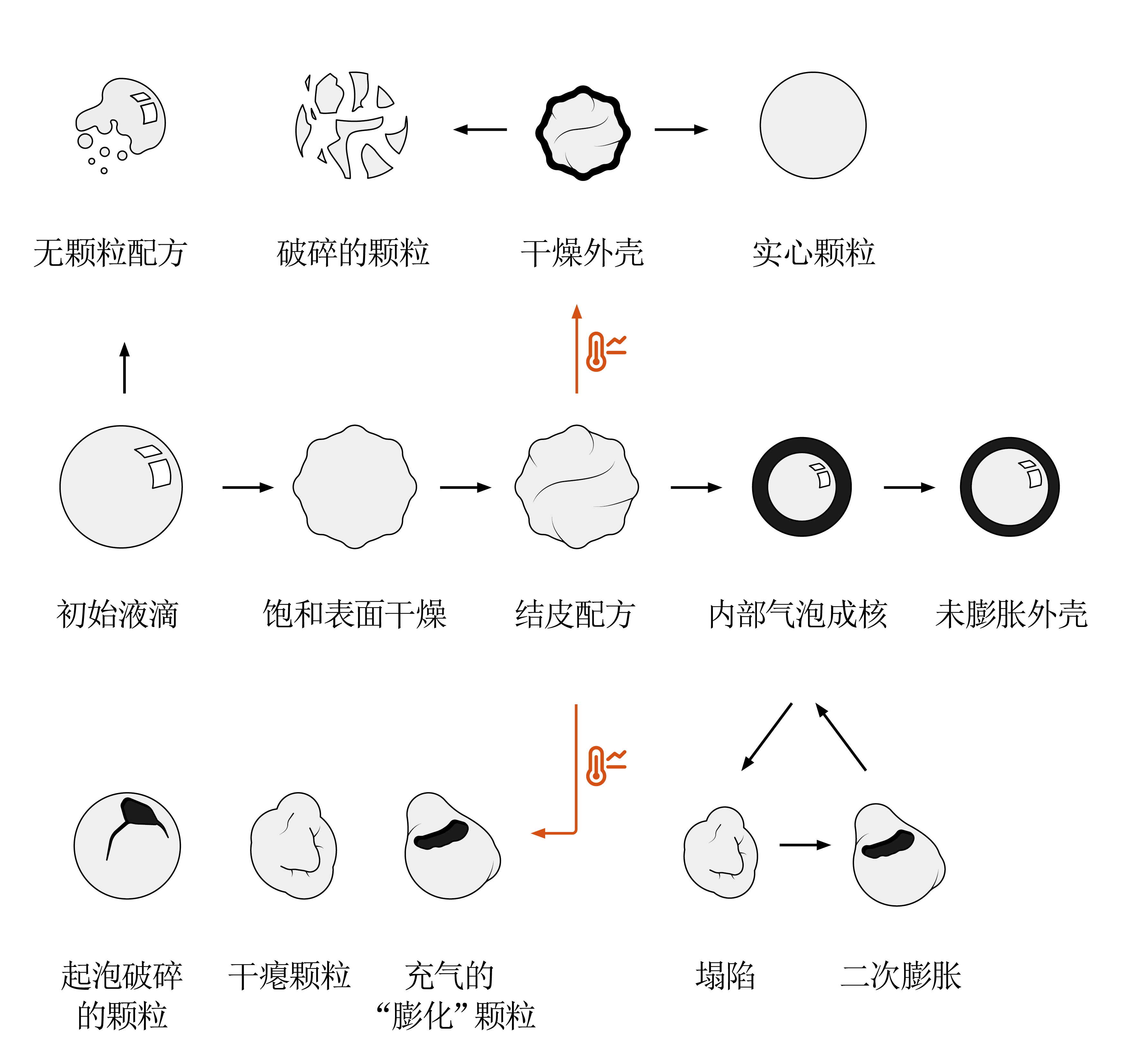 溶劑蒸發:水分以恒定速率從液滴表面蒸發。隨著干燥的進行,表面會干燥形成殼體,之后水分的取出成為擴散控制過程,直至取出所有剩余水分。溶劑蒸發是顆粒形成和塑造最終產品形態中最重要的步驟。