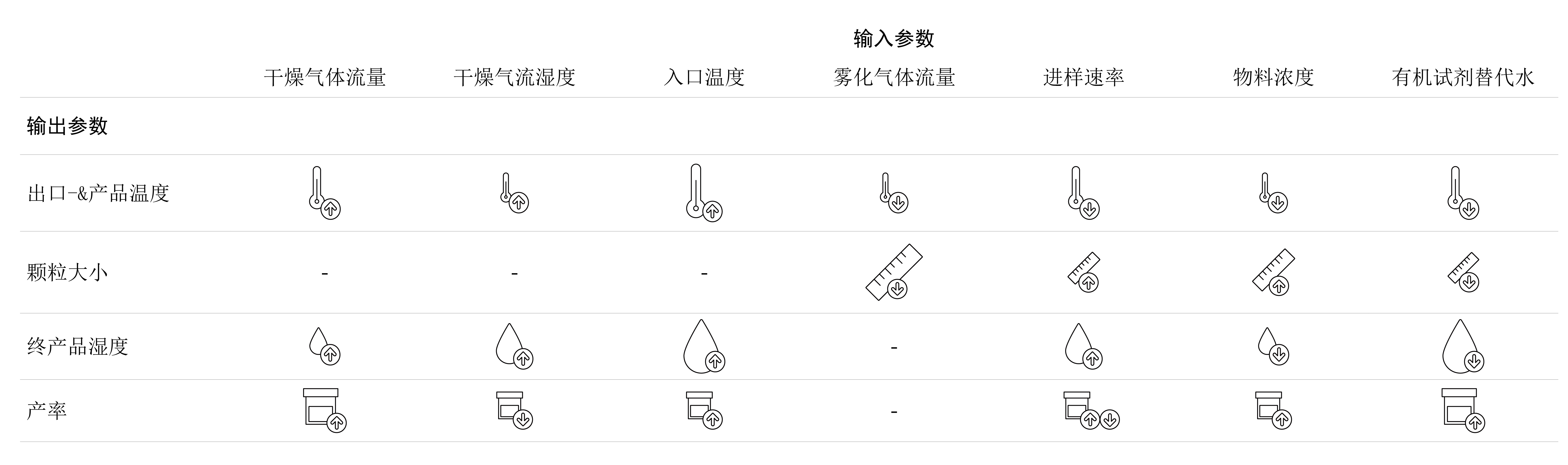 該表顯示當其中一個輸入參數(橫坐標)增加時輸出參數(縱坐標)的變化關系。表中圖片大小表示改變影響程度,箭頭表示影響方向。
