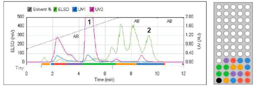 使用 Pure C-815 對(duì)丁香油萃取物進(jìn)行分離純化,并通過 ELSD 與 DAD 雙檢測(cè)器對(duì)分離產(chǎn)物進(jìn)行檢測(cè),保證樣品檢測(cè)“萬無一失”