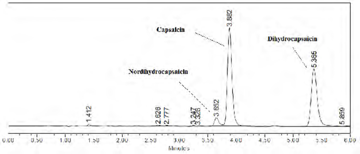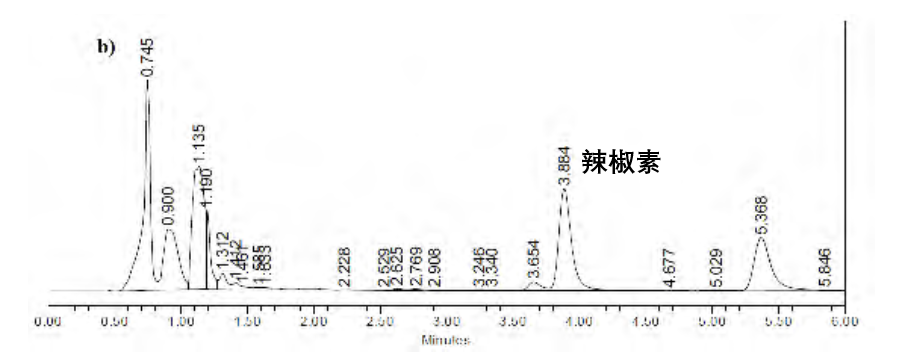 通過 HPLC 分離后,可以看到除了 3.882 min 的辣椒素,在 5.365 min 還有一個化合物,這是與辣椒素結構相似的二氫辣椒素。