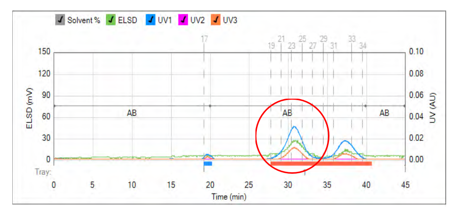 辣椒皮中含有多種化合物,僅通過柱層析色譜或中壓制備色譜很難獲得高純度的單一化合物。步琦 Pure C-850 純化分離系統支持中壓和高壓雙模式,一臺儀器就能完成大量樣品的中壓粗分富集與高壓高純度純化,分離天然產物時具有明顯的優勢。在本次應用中,通過中壓和高壓的兩次分離,最終 24 與 25 管餾分的峰面積能達到 95% 以上,可以進行下一步的生物活性測試。