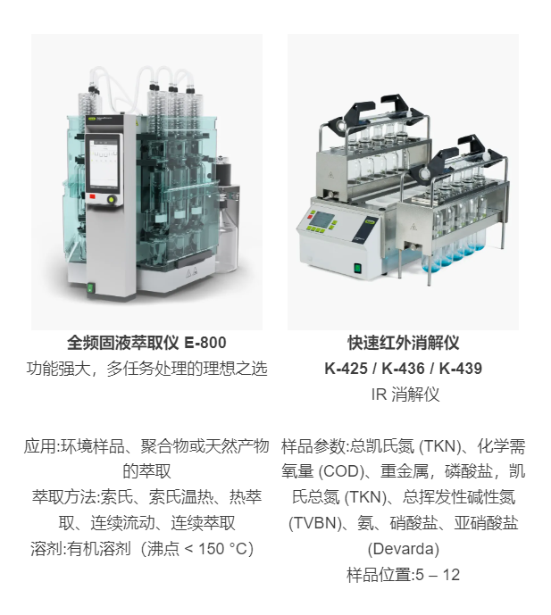 BUCHI 針對環境樣品提供了一個完整的前處理解決方案。即使對于復雜及較難分析的樣品,也能實現快速高效率的提取,保證了較高的回收率和較低的結果偏差。