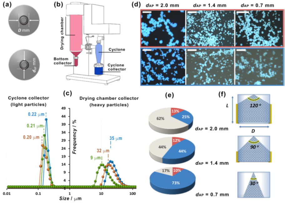 ▲ 圖2。(a)噴霧干燥噴嘴示意圖,突出了噴嘴直徑(上)和噴嘴孔徑(下)。(b)噴霧干燥機收集固體產品的區域:干燥室底部收集器(紅色區域)和旋風收集器(藍色區域)。(c)底部收集器(上)和旋風收集器(下)通過不同孔徑的噴嘴噴射產生的固體餾分粒度分布:2.0 mm(藍色)、1.4 mm(紅色)和0.7 mm(綠色)。(d)噴嘴孔徑分別為2.0 mm、1.4 mm和0.7 mm的底部(紅色框)和旋風收集器(藍色框)收集的固體產物光學顯微鏡圖像(從左至右為柱);比例尺對應100 μm。(e)旋風收集器(藍色區域)、底部收集器(紅色區域)和干燥室沉積物(米色區域)收集的固體產品質量分布圖;(f)孔徑分別為2.0 mm、1.4 mm和0.7 mm的噴嘴產生的噴霧幾何形狀(從上到下)。橙色區域表示濕噴霧與干燥室壁的接觸區域。