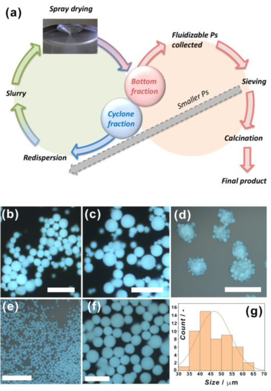 ▲ 圖3。(a)“循環再循環”概念的示意圖。在底部容器中的復合顆粒收集是通過噴涂(b)新鮮配制的漿料(60 wt.%高嶺土,20 wt.% ZSM-5和20 wt.% Al2Cl(OH)5)制備的;(c)經球磨預處理(標尺- 100 μm)和(d)不經此預處理(標尺- 500 μm),由旋風收集器的細粒再分散制備的漿料。在不同倍率下(e) ×5(標尺- 500 μm)和×20(標尺- 100 μm)煅燒和篩分至粒徑> 38 μm的最終粉末的光學顯微圖。(g)復合材料終組分粒度分布圖。噴霧干燥條件:?噴嘴= 2.0 mm,Tin= 210℃,進料= 15 mL·min-1,氣體流量= 473 L·h-1,抽氣機= 80%。