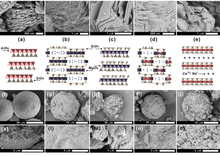 ▲ 圖4。(a)高嶺石,(b)海泡石,(c)滑石,(d)硅鎂石,(e)蒙脫石;相應的晶體結構表示如下:AlO6八面體表示為赤土色,SiO4四面體表示為米色,MgO6八面體表示為紫色,藍色球體表示為水分子,紫色表示為Ca2+/Na+陽離子。(f-j)由20wt .%的ZSM-5(SAR 23)、20wt .%的Al2Cl(OH)5和60wt .%的粘土-高嶺土(f)、海泡石(g)、滑石(h)、硅鎂石(i)和蒙脫土(o)組成的噴霧干燥顆粒(f-j)。