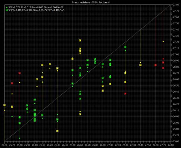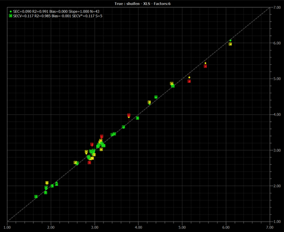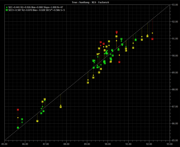 分別準備山梨醇樣品 60 個和古龍酸樣品 59 個,已知山梨醇樣品水分和古龍酸樣品中水分和古龍酸含量,并用 BUCHI ProxiMate 測量上述樣品的近紅外光譜,隨后使用軟件 AutoCal 自動建模,所得模型如下: