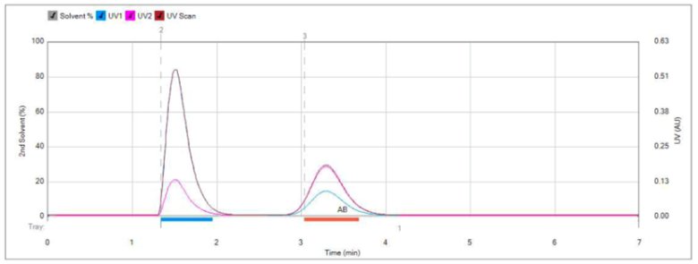 通過堆疊,1mL 的樣品能夠得以純化,這與制備型高效液相色譜(prep HPLC)運行時所使用的樣品量相同。在此需要指出的是,制備型超臨界流體色譜(prep SFC)中使用的是 250×10mm 的色譜柱,而制備型高效液相色譜(prep HPLC)中使用的則是 150×20mm 的色譜柱。此次堆疊運行的總運行時間為 8 分鐘。