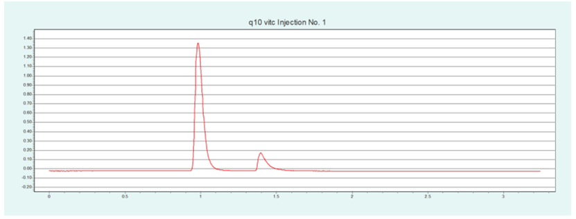 圖2 顯示,輔酶 Q10 的色譜峰出現在 1min 后,維生素 C 的色譜峰出現在 1.3min 后。選擇 265nm 波長進行檢測,這解釋了較低的吸光度。由于選擇了硅膠作為固定相,非極性的輔酶 Q10 首先流出色譜柱,而極性更強的維生素 C 與硅膠的相互作用更強,因此流出色譜柱的時間較晚。