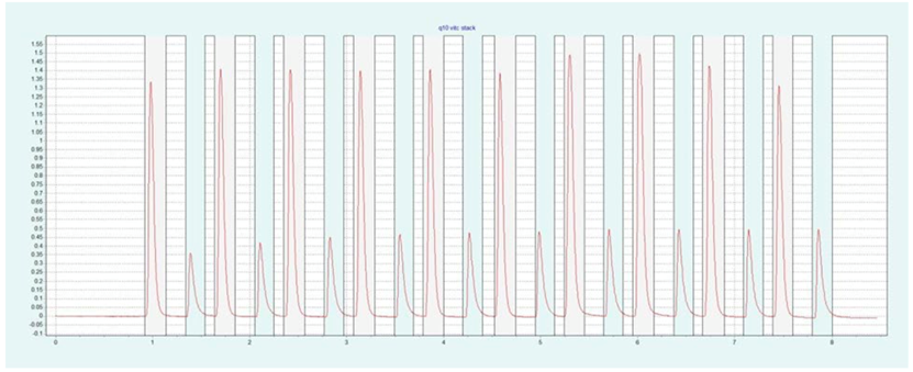 由于這是一種等度洗脫運行,因此適用于疊加進樣。選擇了與單次進樣完全相同的條件,疊加時間為 0.72min,進樣 10 次,如 圖3 所示。總運行時間為 8 min,平衡時間為 1.5min。