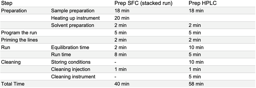 表1:制備型 SFC 和制備型 HPLC 純化等量樣品的時間差異。