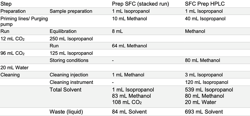 在兩種方式中,樣品制備都需要 IPA,這也是 HPLC 運行所選擇的流動相。SFC 方法采用甲醇和 CO2。HPLC 需要額外的溶劑來保存色譜柱,如水和甲醇。水是一種綠色流動相,但由于它與儀器中的溶劑混合在一起,因此仍然需要丟棄在化學廢物中。在 表2 中顯示,在 HPLC 運行中產生的溶劑浪費比 SFC 運行多 7.5 倍。