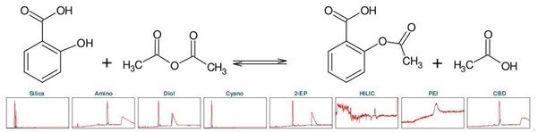 阿司匹林,化學名為乙酰水楊酸(下稱 ASA),是一種眾所周知的鎮痛和抗炎藥物。它屬于非甾體抗炎藥(NSAIDs)這一類??梢酝ㄟ^將水楊酸(下稱 SA)與乙酸酐發生酯化反應而化學合成(見圖5) [1] 。為了確定乙酰水楊酸的理想分離選擇性,首先進行了色譜柱柱篩選(見圖1)。