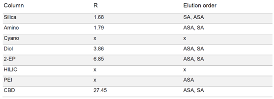 ▲ 表1:樣品在不同固定相色譜柱條件下的分辨率值和洗脫順序