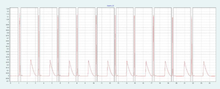 ▲ 圖 4:苯佐卡因的單次注射(頂部)和堆疊注射(底部)純化;運行條件:流速 = 20 mL/min, 改性劑 = 甲醇,改性劑 % = 28%,溫度 = 40 °C,壓力 BPR = 150 bar,注射量 = 90 μL,UV 波長 =276nm;堆疊注射條件:注射次數 =12,堆疊時間 =0.66min,餾分 =1(基于時間的)。