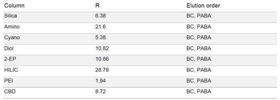 由于 PABA 在固定相中的保留性較強,因此在梯度中增加了一個等度步驟,在 50% 甲醇的條件下運行 5 分鐘,硫酸通過洗滌步驟去除避免過高的酸性。各固定相的色譜圖顯示,每種固定相都能分離苯佐卡因,但是洗脫速度和分辨率存在很大差異(見表2)。HILIC 和氨基相的分辨率最高,但 PABA 的保留時間過長,即使用50%的甲醇洗脫,依舊需要很長時間。