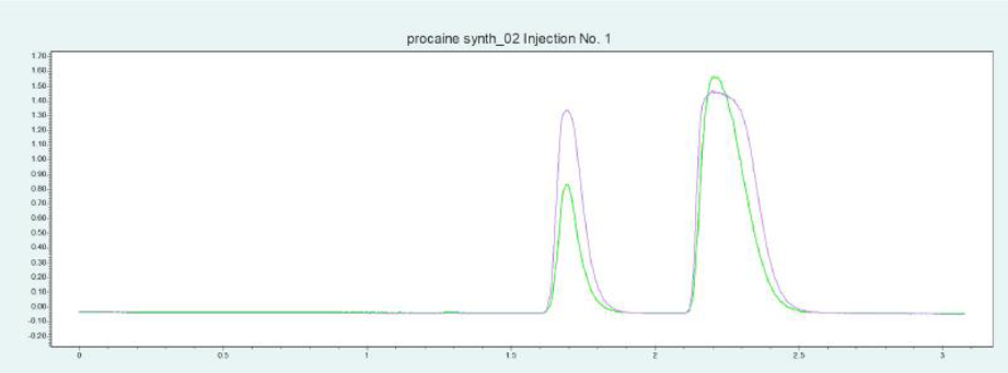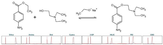 普魯卡因(下稱 PC),化學名為 4-氨基苯甲酸 2-(N, N-二乙基氨基)乙酯,是一種藥物,具有局部麻醉作用。它阻斷電壓依賴性鈉離子通道,從而導致例如疼痛敏感性的降低。普魯卡因可以通過化學方法在堿性條件下從 4-氨基苯甲酸乙酯(下稱ABE)合成。這涉及到使用 2-二乙基氨基乙醇進行酯交換[3]。堿是乙醇鈉醇,它可以通過鈉與乙醇的反應產生。為確定普魯卡因合成產物純化的理想選擇性,進行了色譜柱篩選(見圖 5)。