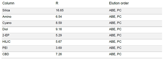 ▲ 表2:樣品在不同固定相色譜柱條件下的分辨率值和洗脫順序。