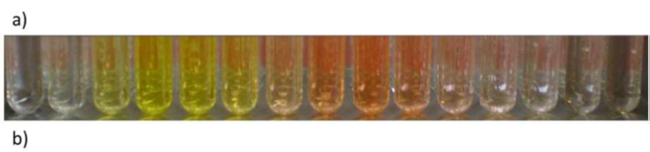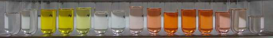 在所有條件下,染料溶液似乎都被分離成紅色和黃色成分(圖1)。