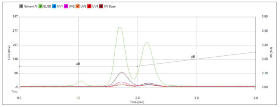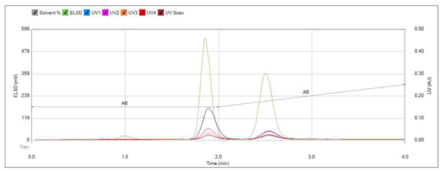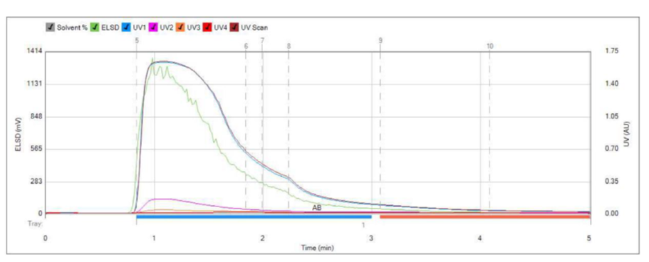 ▲ 圖5. 優化方法(實驗4)的色譜圖,使用 FlashPure Select 硅膠色譜柱,帶有己烷和乙酸乙酯梯度流動相