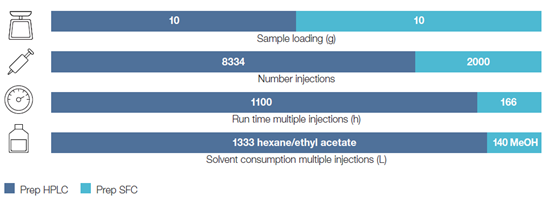 將酮洛芬小試純化分離的條件線性放大到 10g,SFC 的優勢變得更加明顯。制備型 HPLC 需要驚人的 8334 次注射和超過 1100 小時的運行時間。相比之下,制備型SFC 只需 2000 次進樣就能達到同樣的效果,節省了 900 多個小時的運行時間,并減少了 90% 的溶劑用量,展現出卓越的應用效能與經濟效益。